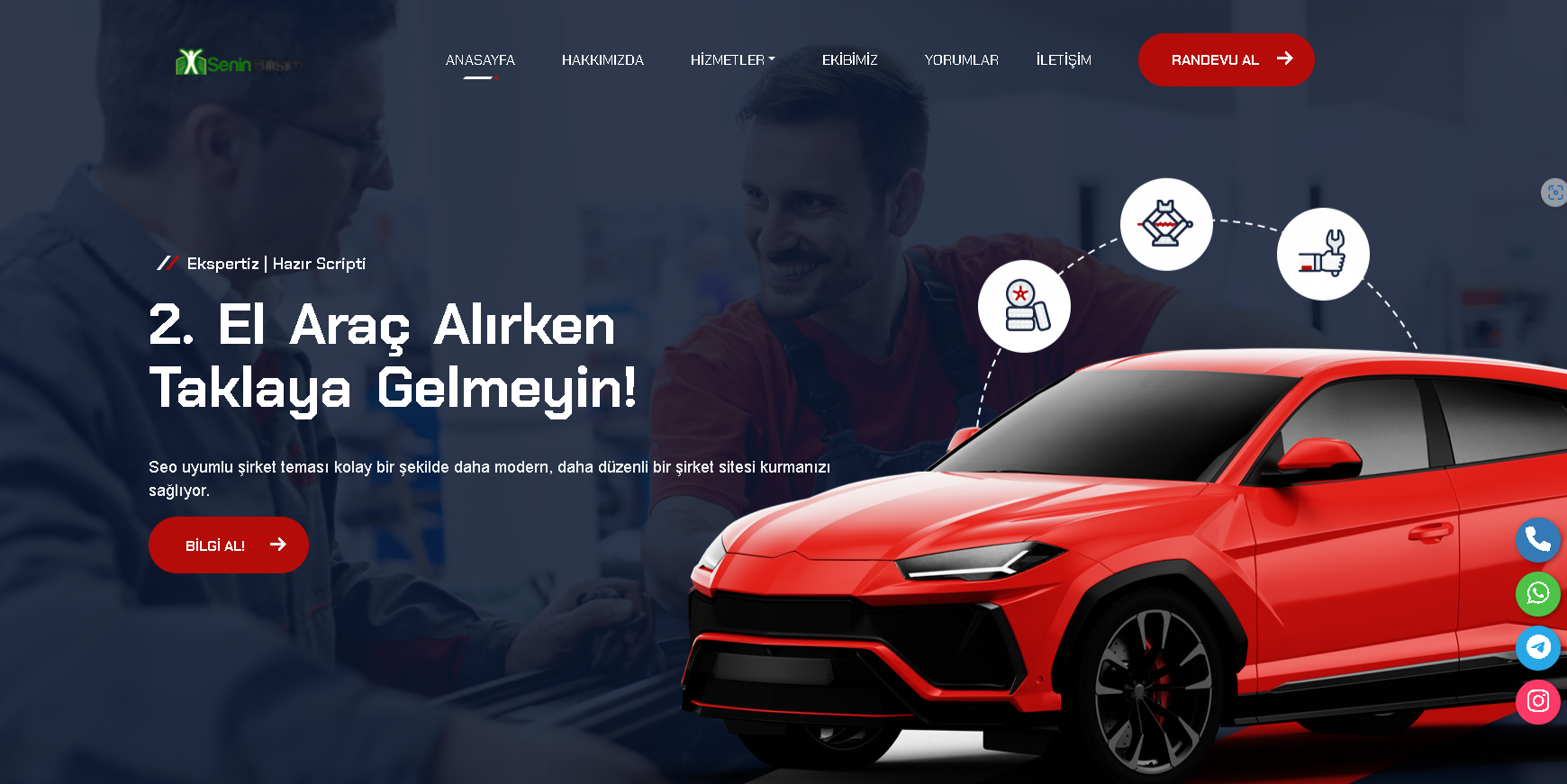 Ekspertiz Oto Araç Firma Hazır scripti ile bir çok alanda kullanabileceğiniz oto, araç kiralama, ekspertiz işletmeleriniz tam size hitap eden tasarım olan php kodlama alt yapısına sahip, büyük slide alanı ile göze hitap eden responsive mobil uyumlu tasarımla sizde işletmenize renk katarak müşterilerinize kolayca hizmet sağlayacaksınız.