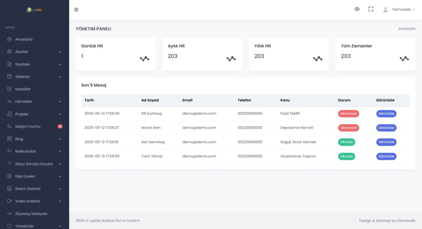 Bu yazılım sayesinde sizde lojistik firması arayan işletmelerin sizleri ve işletmenizi kolayca bulmasını sağlayabilirsiniz. Günümüzde artık hemen hemen her şeyin internet dünyasında aranarak bilgi sahibi olunduğunu unutmayarak sizde firmanıza kar sağlamayı ve şirket kalitesini bir adım önde tutmayı unutmayın. Admin panel bilgileri için whatsapp yoluyla iletişime geçebilirsiniz.