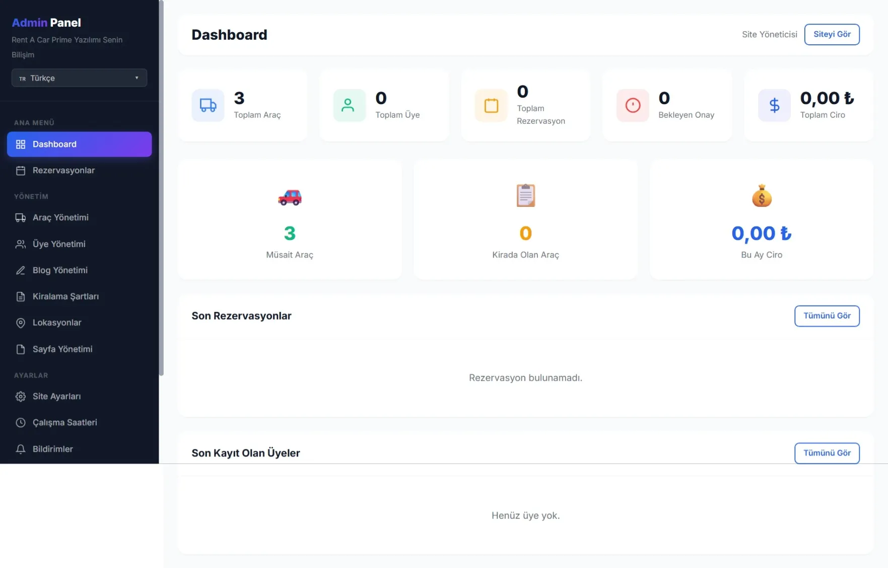 Araç ekleme, rezervasyon yönetimi, müşteri takibi, lokasyon ayarları, blog içerikleri, ödeme bilgileri ve site ayarları tek bir admin paneli üzerinden kolayca kontrol edilir. Araç durumu, rezervasyon hareketleri, kullanıcı işlemleri ve genel site yönetimi tek merkezde toplanarak işletme sürecinizi hızlandırır.