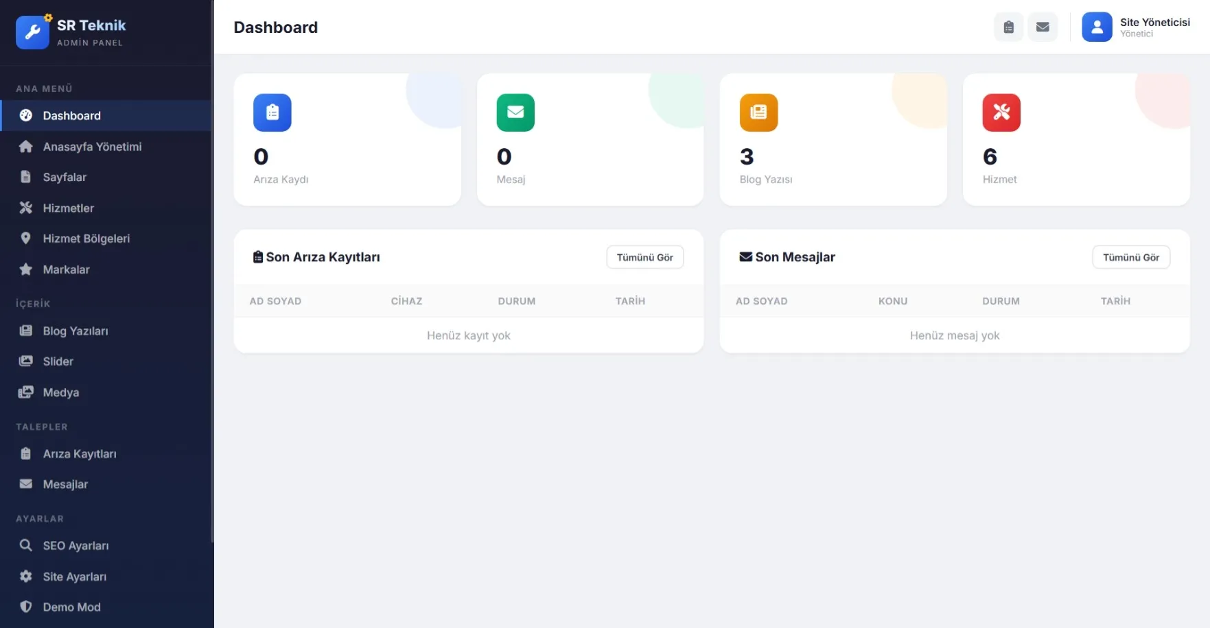 Beyaz eşya servis firmaları için geliştirilen bu hazır script; müşteri taleplerini toplamak, hizmet bölgelerini sergilemek, servis markalarını göstermek ve tüm süreci tek panelden yönetmek isteyen işletmeler için profesyonel bir altyapı sunar. Ana sayfa, hizmetler, hizmet bölgeleri, marka sayfaları, blog, iletişim ve arıza kayıt akışıyla hem kurumsal görünüm hem de kullanım kolaylığı sağlar.